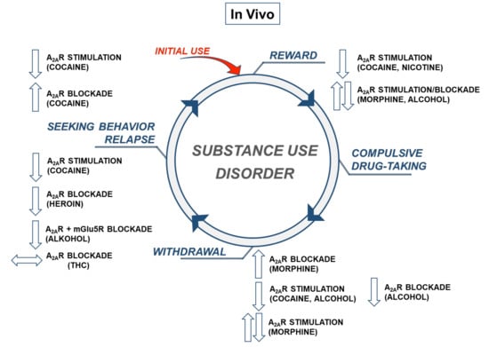 Numerous preclinical studies confirmed functional interactions between A2ARs and drugs of abuse with different mechanisms of action on the central nervous system. Using classical pharmacological tools (agonists or antagonists of A2ARs), as well as animal genetic models (overexpression or knockout (KO) of A2ARs) studies demonstrated an involvement of these receptors in the locomotor response, drug discrimination, reward-seeking behavior, and withdrawal syndrome associated with the use of psychostimulants (cocaine, amphetamine, methamphetamine, and 3,4-methylenedioxymethamphetamine (MDMA)), nicotine, opioids (morphine and heroin), cannabinoids (∆9-tetrahydrocannabinol (THC)), and ethanol.