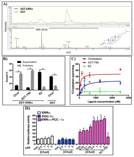 Cholesterol binds to ERRα and increases its activity: (A) Human pregnancy serum was incubated with Sepharose beads coupled to GST-ERRα-LBD and or unfused GST for 24 h at 4 °C and pull-down samples were analyzed using LC-MS. The upper panel shows the UV chromatogram and the lower panel displays the mass spectrum. The cholesterol structure is located at the right corner of this spectrum. (B) Cholesterol directly binds to ERRα-LBD. GST-ERRα-LBD pull down assays were performed and cholesterol concentrations were measured using LC-MS in MRM mode. XCT-790 and E2 concentrations were determined using a UV–vis spectrophotometer. Amounts are reported as % input. (C) Relative affinity of cholesterol for ERRα was assessed using a tryptophan quenching assay with fluorescence excitation at 295 nm and florescent emission at 310 nm. (D) Cholesterol increases transcriptional activity of ERRα in a PGC-1α dependent manner in a luciferase reporter assay. HEK 293 cells were transiently co-transfected with a pS2-LUC reporter plasmid with or without expression vectors for ERRα and the PGC-1α co-activator. The data are representative of 3 independent experiments. A value of p < 0.05 compared with the control group was considered significant (*).
