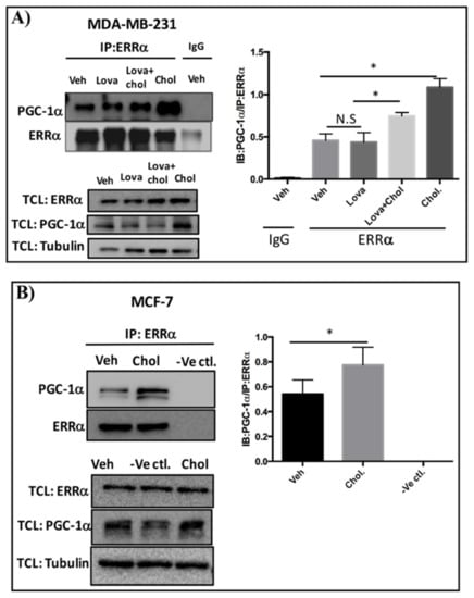 MDA-MB-231 cells were seeded in 10 cm plates and were treated with vehicle (veh), lovastatin (lova), cholesterol + lovastatin (chol + lova) or cholesterol (chol), all at 5 μM. After 24 h the cells were harvested and lysed with non-denaturing lysis buffer (20 mM Tris-HCl, pH 8, 137 mM NaCl, 10% glycerol, 1% Nonidet P-40, 2 mM EDTA, and protease inhibitors (Sigma Aldrich)). Co-immunoprecipitation (co-IP) was carried out as described previously []. The above-mentioned cell lysates (500 μg of total protein) were immunoprecipitated with rabbit anti-ERRα antibody (10 μg) or control rabbit immunoglobulin G (IgG, 10 μg) (12-370(CH), Millipore) overnight at 4 °C with end over end shaking, followed by a 2 h incubation with Protein A Sepharose 4B (20 μL) (10-1141, Invitrogen) at 4 °C. Supernatants were removed after sample centrifugation. The pellets containing beads were washed three times with ice-cold lysis buffer and bead-bound proteins were eluted, denatured and immunoblotted using mouse anti-ERRα antibody or mouse anti-PGC-1α antibody. 2% of the total cell lysates (TCL) were used to detect endogenous levels of ERRα and PGC-1α in cells treated with vehicle, lovastatin, cholesterol + lovastatin or cholesterol.