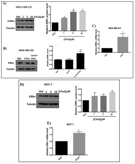 Cholesterol increases ERRα protein and mRNA levels in MDA-MB-231 and MCF-7 cells in a dose dependent manner. (A) Cholesterol increases ERRα protein levels in MDA-MB-231 cells in a dose dependent manner. MDA-MB-231 cells were treated with vehicle (Veh) and varying concentrations of cholesterol (1, 5, 10 μM) and subjected to western blotting. (B) Cholesterol increases ERRα protein levels even in the presence of lovastatin in MDA-MB-231 cells. MDA-MB-231 cells were treated with vehicle (Veh), lovastatin (Lova) or Lovastatin + cholesterol (Lova + Chol) at 5 μM for 24 h. Cell lysates were subjected to western blotting. Relative ERRα protein levels were assessed using ImageJ software. (C) Cholesterol induces ERRα mRNA levels in MDA-MB-231 cells. Cells were treated with 5 μM cholesterol for 24h and ERRα mRNA levels were assessed by RT-qPCR and were normalized to endogenous GAPDH. (D) Cholesterol increases ERRα protein levels in MCF-7 cells in a dose-dependent manner. MCF-7 cells were treated with varying concentrations of cholesterol (1, 5, 10 μM) or vehicle (Veh) and subjected to western blotting. Relative ERRα protein levels were calculated using ImageJ software. (E) Cholesterol induces ERRα mRNA levels in MCF-7 cells. Cells were treated with 10 μM cholesterol for 24 h and ERRα mRNA levels were assessed by RT-qPCR, and were normalized to endogenous GAPDH. A minimum of three independent experiments were performed. A value of p < 0.05 was considered significant (*).