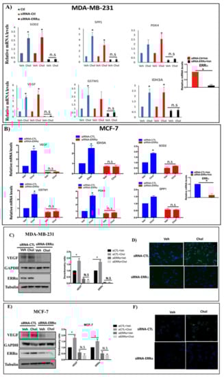 However, in ERRα knockdown breast cancer cells, cholesterol does not enhance the expression of ERRα target genes in either MDA-MB-231 or MCF-7 cells. As shown in Figure 4A,B, the efficiency of knockdown-ERRα was 89.9% and 82.7% for MDA-MB-231 and MCF-7 cells, respectively.