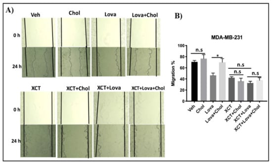 (A) Lovastatin decreases the migration of MDA-MB-231 cells, while cholesterol rescues the effect of lovastatin, but not the effect of XCT-790 using a scratch-wound migration assay, MDA-MB-231 cells were treated with vehicle(Veh), cholesterol (chol), lovastatin (Lova), Lovastatin + cholesterol (Lova + Chol), XCT-790 (XCT), XCT-790 + cholesterol (XCT + chol), XCT-790 + lovastatin (XCT + Lova) or XCT-790 + lovastatin + cholesterol (XCT + Lova + Chol), all at 5 μM. Wound closure was monitored at 0 and 24 h, and representative images are provided. (B) Migration percentages were calculated as follows: migration % = (T 0 h scratch width − T 24 h scratch width/T 0 h scratch width) × 100. The results represent 3 independent experiments. A value of p < 0.05 was considered significant (*).