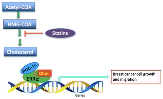 The ERRα/PGC-1α/β complex is the main regulator of genes involved in energy metabolism and mitochondrial biogenesis and directs metabolic reprogramming in cancer cells. It has been reported that this complex controls the expression of genes involved in the TCA cycle, OXPHOS, lipid metabolism, and glycolysis in breast cancer cells [,]. It is thus significant that cholesterol binding to ERRα and cholesterol-mediated increase in ERRα-PGC-1α interaction result in increased expression of ERRα itself and its metabolic target genes including IDH3A, VEGF, SOD2, GSTM1, PDK4, SPP1 in breast cancer cells. The finding that the cholesterol-mediated increase in the expression of these genes requires ERRα in both ER-positive and triple-negative breast cancer cells provides a mechanistic explanation for the adverse effect of high circulating cholesterol levels and may explain the beneficial effect of statins on breast cancer outcome.