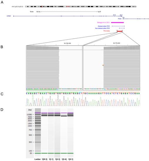 CNVs were identified based on exome coverage depth data for all 307 genes of interest using Sequence Pilot version 5.0 (JSI Medical Systems GmbH, Ettenheim, Germany). The CRIM1 deletion was confirmed in index patient 1[III:3] from family 1 by long-range PCR and subsequent NGS sequencing of the deletion-spanning breakpoint fragment, as previously described []. Briefly, a fragment of 22,240 bp, including exons 14 to 17, the 3′ untranslated region (UTR) of CRIM1, as well as exon 9 and the 5′ UTR of FEZ2, was amplified with TaKaRa LA Taq polymerase (Takara Bio, Kasatsu, Japan). Long-range PCR was performed in a total volume of 30 µL, containing 1x Buffer Mg2+ free, 1x S-Solution (Solis Biodyne), 400 µM dNTP Mix, 0.4 µM of each primer, 0.05 U/µL LA Taq polymerase, and 50 ng of genomic DNA. PCR was carried out on a Veriti 96 Well Thermal Cycler (Applied Biosystems) as follows: 94 °C for 2 min; 35 cycles at 98 °C for 10 s and 68 °C for 12 min; 72 °C for 10 min. Primers were designed to flank the deleted region, with the forward primer (5′-AAA TGG CAC AAC CCT GAT AGC CAC ACA T-3′) located in intron 13 of CRIM1 and the reverse primer (5′-CAC AGG GAG GGA AGC GGG GAA ATA AAA A-3′) located in intron 8 of FEZ2. Amplicons were fragmented using the Covaris M220 Sonicator (Covaris, Woburn, MA, USA) for a target size of 350 bp. Library preparation was carried out with the TruSeq DNA Nano Kit (Illumina) according to the manufacturer’s protocol. The library was quantified with the Qubit dsDNA High Sensitivity Kit (Thermo Fisher Scientific) and validated using the Agilent High Sensitivity DNA Kit (Agilent, Santa Clara, CA, USA) with the 2100 Bioanalyzer (Agilent), according to the manufacturer’s instructions. Final libraries were diluted to a loading concentration of 12 pM. Paired-end sequencing (2 × 151 cycles) was performed on the MiSeq system (Illumina). Data were aligned to the human reference genome (hg19) with the Burrows-Wheeler Aligner (BWA-MEM), and variant calling was performed using the Genome Analysis Toolkit (GATK). Sequences were visualized using Alamut Visual version 2.10 (Sophia Genetics). Breakpoints were identified using the NGS data and confirmed by Sanger sequencing of the junction fragments. Primer sequences are available upon request. Multiplex PCR, using primers from long-range PCR and a second forward primer (5′-GTT TCC GTT TTT GGC TTT GGC TGC TAC A-3′) located in intron 15 of CRIM1, was performed for segregation analysis in available family members. PCR products were analyzed by agarose gel electrophoresis and run on a 2100 Bioanalyzer (Agilent) using the Agilent DNA 12000 Assay (Agilent), according to the manufacturer’s instructions.