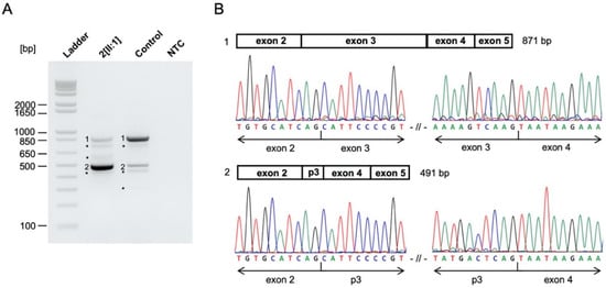 CHD7 c.2095A>G variant alters splicing in functional analysis. (A) Agarose gel of RT-PCR products for patient- and control-derived cDNA and the NTC. RT-PCR showed correctly spliced transcript (Fragment 1), partial exon 3 skipping (Fragment 2), and additional nonspecific or alternatively spliced DNA fragments (not sequenced) in index patient 2[II:1] and the control. Partial exon 3 skipping (Fragment 2) was more pronounced in index patient 2[II:1] compared to the control. Ladder, 1 Kb Plus DNA Ladder (Thermo Fisher Scientific); NTC, no template control. * nonspecific or alternatively spliced DNA fragments. (B) Schematic overview and Sanger sequencing results of RT-PCR products. Sanger sequencing revealed correctly spliced CHD7 transcript (Fragment 1) and a 380-nt deletion from the 3′ end of exon 3 (Fragment 2) due to the CHD7 c.2095A>G variant. p3, partial exon 3.