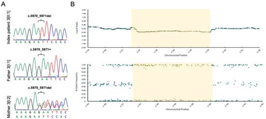 Genetic analysis showed that index patient 3[II:1] was compound heterozygous for a novel frameshift variant (NM_005245.3:c.5970_5971del, p.(Asn1991PhefsTer19)) and a novel deletion of FAT Atypical Cadherin 1 (FAT1). CNV analysis and SNP array analysis revealed an approximately 1.8-Mb deletion in the 4q35.2 region, including FAT1 and flanking genes F11, MTNR1A, and ZFP42 (Figure 5B). Proximal and distal breakpoints were narrowed down to the positions g.(187,179,210–187,179,486 and 188,926,200–189,012,426; hg19) using WES and SNP array analysis data. According to segregation analysis and SNP array analysis, the frameshift variant was transmitted from the mother, whereas the deletion was inherited paternally (Figure 5). No variants matching our filtering criteria or CNVs were detected in PAX6. Index patient 3[II:1] was diagnosed with anterior polar cataract and macular hypoplasia (grade 2) [] in both eyes, iris and chorioretinal coloboma in the right eye, left congenital ptosis, syndactyly of the 4th and 5th toe, and hearing impairment (Figure 3D–F). Both parents showed no evidence of ocular or systemic abnormalities or diseases.