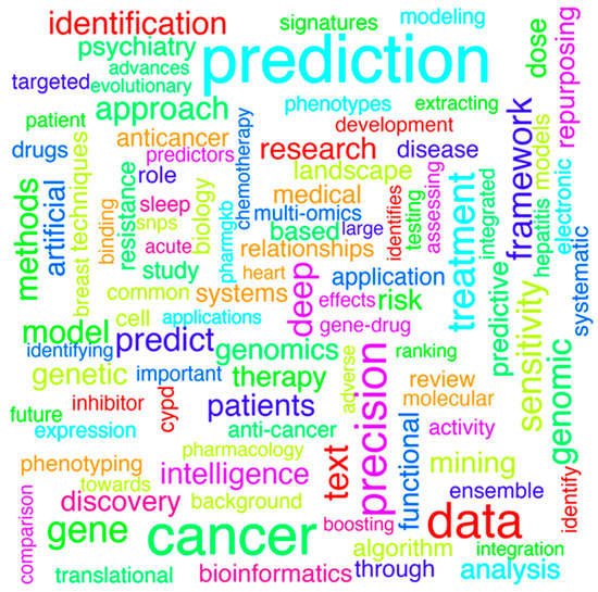 Word-cloud analysis using the titles of articles obtained based on the following search strategy (PubMed): machine learning AND pharmacogenetics. The pre-processing procedures applied were: (1) removing non-English words or common words that do not provide information; (2) changing words to lower case and (3) removing punctuation and white spaces. The size of the word is proportional to the observed frequency.