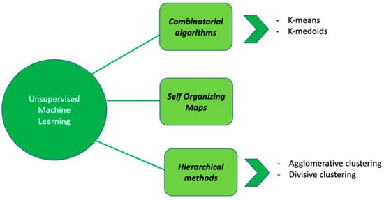 Regarding UML, data-driven approaches by using clustering methods can be used to describe data with the aim of understanding whether observations can be stratified into different subgroups. Clustering methods can be divided into (i) combinatorial algorithms, (ii) hierarchical methods and (iii) self-organizing maps (Figure 3).