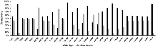 Frequency of substitutions in the PvCyRPA of P. vivax isolates from Brazilian Amazon. The two colors (black and gray) represent the two alleles within a population: reference allele and variant allele, respectively. The identification code represents the amino acid in the Sal-1 reference sequence (first character), followed by the position of this residue (number), and the replacing amino acid observed at the same position (last character).