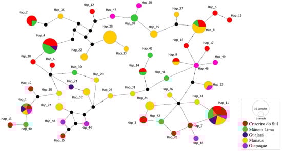 The median-joining haplotype network constructed by PopArt 1.7 using the 98 sequences produced a total of 50 haplotypes with some of which consisting of more than one sequence from the Brazilian Amazon (Figure 3). The haplotype network to explore the parasite relationships based on the pvcyrpa gene and comprising mutations at 34 segregating sites. All 50 haplotypes were found closely related. The haplotypes Hap_1 and Hap_11 had high frequency and shared parasites from all five localities. The haplotype Hap_4 (Cruzeiro do Sul, Mâncio Lima and Guajará) and Hap_8 (Cruzeiro do Sul, Mâncio Lima and Manaus) both shared parasites from three localities. Moreover, the haplotypes Hap_2 (Cruzeiro do Sul and Mâncio Lima) and Hap_9 (Cruzeiro do Sul and Manaus), Hap_14 (Cruzeiro do Sul and Mâncio Lima), Hap_23 (Manaus and Oiapoque) shared sequences from 2 localities. The other haplotypes had sequences from only one location.