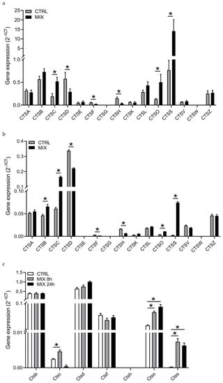 We have previously demonstrated that the T1D candidate gene CTSH is expressed and downregulated by pro-inflammatory cytokines in human pancreatic islets, primary rat β cells, as well as in the human 1.1B4 cell line [,]. To investigate if the cathepsin proteases in general are expressed and regulated by pro-inflammatory cytokines, we examined the expression of the 15 human cathepsins by real-time qPCR in isolated human pancreatic islets left untreated or exposed to IL-1β+IFN-γ for 24 h. The results showed that 13 cathepsins are expressed in human islets (Figure 1a). Cathepsin G (CTSG) and W (CTSW) were not detected. Six cathepsins were differentially expressed in human islets exposed to IL-1β+IFN-γ; cathepsin C (CTSC), O (CTSO) and S (CTSS) were upregulated, whereas CTSD, F (CTSF) and CTSH were downregulated (BH-corrected p < 0.05; Figure 1a). All 15 cathepsins were then examined in 1.1B4 cells, which is a recently established hybrid of a primary human β cell and the pancreatic ductal cell line PANC-1 []. The results showed that 12 cathepsins are expressed in 1.1B4 cells (Figure 1b). Cathepsin E (CTSE), CTSG and CTSW were not detected. Seven cathepsins were differentially expressed in 1.1B4 cells after 24 h of exposure to IL-1β+IFN-γ+TNF-α; CTSB, CTSC, CTSO and CTSS were upregulated, whereas cathepsin D (CTSD), CTSF and CTSH were downregulated (Bonferroni-adjusted p < 0.05; Figure 1b). The seven differentially expressed cathepsins were then examined in rat INS-1E cells after exposure to IL-1β+IFN-γ for 8 and 24 h and compared to untreated cells. Except for Ctsh, the selected cathepsins were expressed in INS-1E cells (Figure 1c). Three cathepsins were differentially expressed in response to cytokines; Ctsc was upregulated after 8 h, and Ctso and Ctss were upregulated at both 8 and 24 h, as compared to untreated INS-1E cells (Bonferroni-adjusted p < 0.05; Figure 1c).