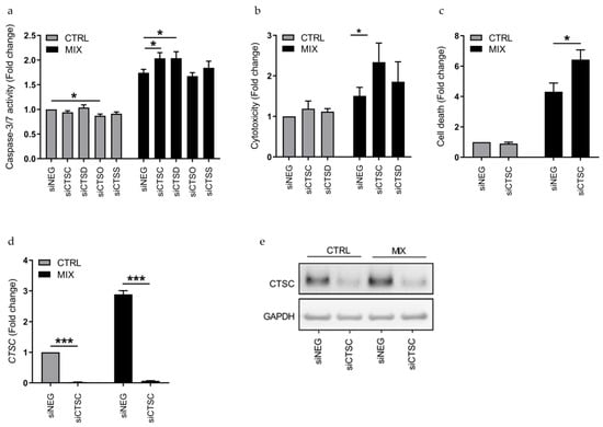 Knockdown of CTSC increases caspase-3/7 activity, cytotoxicity and cell death in 1.1B4 cells. (a) Caspase-3/7 activity in 1.1B4 cells transfected with siRNAs against CTSC (siCTSC), CTSD (siCTSD), CTSO (siCTSO), CTSS (siCTSS) or a non-targeting negative control siRNA (siNEG) and left untreated (CTRL) or exposed to IL-1β, IFN-γ and TNF-α for 24 h (MIX). Caspase-3/7 activities were normalized to total cell content. The data are presented as fold changes with means ± SEM (n = 6). (b) Cytotoxicity in 1.1B4 cells transfected with siCTSC, siCTSD or siNEG and left untreated (CTRL) or exposed to IL-1β, IFN-γ and TNF-α for 24 h (MIX). Cytotoxicity measurements were normalized to total cell content. The data are presented as fold changes with means ± SEM (n = 4). (c) Cell death in 1.1B4 cells transfected with siCTSC or siNEG and left untreated (CTRL) or exposed to IL-1β, IFN-γ and TNF-α for 24 h (MIX) as measured by the Cell Death Detection ELISA. Data were normalized to DNA content (d) mRNA expression of CTSC in 1.1B4 cells treated as in (c), analyzed by real-time qPCR and normalized to GAPDH. Data are presented as fold changes with means ± SEM (n = 4). (e) Protein level of CTSC in 1.1B4 cells treated as in (c), analyzed by immunoblotting with GAPDH as loading control. *: p < 0.05; **: p < 0.01; ***: p < 0.001.