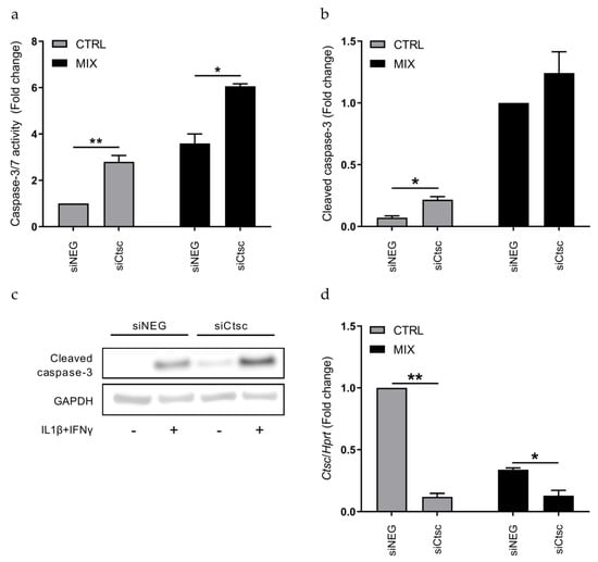 Knockdown of Ctsc increases caspase-3/7 activity in INS-1E cells. INS-1E cells were transfected with siRNAs against Ctsc (siCtsc) or a non-targeting negative control siRNA (siNEG) and then left untreated (CTRL) or exposed to IL-1β and IFN-γ for 24 h (MIX). (a) Caspase-3/7 activity was normalized to total cell content, and data are presented as fold changes with means ± SEM (n = 4). (b) Cleaved caspase-3 protein level as analyzed by immunoblotting. Gapdh was used as loading control. Data are presented as fold changes with means ± SEM (n = 4). (c) Visualized protein bands of cleaved caspase-3 (~17–19 kDa) and Gapdh (~40 kDa), as presented in (b). The blot is representative of 4 blots. (d) Ctsc mRNA expression measured by real-time qPCR and normalized against Hprt. Data are presented as fold changes with means ± SEM (n = 4). *: p < 0.05; **: p < 0.01.