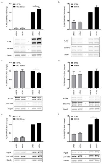 Knockdown of Ctsc regulates MAPK signaling. INS-1E cells were transfected with siRNA against Ctsc (siCtsc) or a non-targeting negative control siRNA (siNEG) and were then left untreated (CTRL) or exposed to IL-1β and IFN-γ (MIX) for 30 min or 6 h. Immunoblotting of phosphorylated JNK after (a) 30 min and (b) 6 h, phosphorylated ERK after (c) 30 min and (d) 6 h, and phosphorylated p38 after (e) 30 min and (f) 6 h. Gapdh was used as loading control. Data are presented as fold changes with mean ± SEM (n = 4–7). *: p < 0.05; **: p < 0.01.