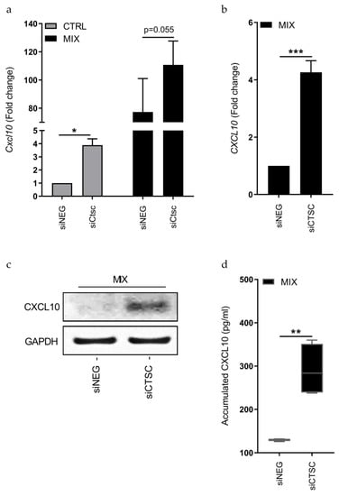 In 1.1B4 cells, there were no basal expression of CXCL10, however, in response to 24 h of cytokine exposure, the CXCL10 expression was 4.3-fold higher upon CTSC KD, as compared to the siNEG-transfected cells (p < 0.001; Figure 5b). Immunoblotting confirmed increased CXCL10 protein after 24 h of cytokine exposure in response to CTSC KD (Figure 5c). Finally, we investigated if the observed effects of CTSC KD on CXCL10 expression were accompanied by increased CXCL10 secretion to the culture medium. Using Luminex bead-based multiplexing immunoassays, we observed a 2.2-fold increase in accumulated CXCL10 in the cell culture medium of cells with CTSC KD, as compared to siNEG transfected cells after 24 h of cytokine exposure (p < 0.01, Figure 5d).
