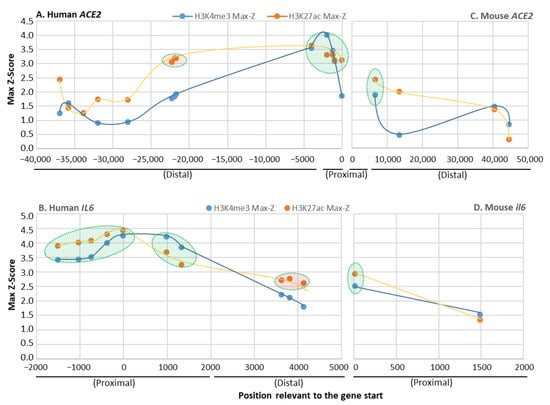 Profiling of positive histone markers (H3K4me3 and H3K27ac) indicating chromatin accessibility of RNA polymerase II adjacent to human and mouse ACE2 and IL-6 gene bodies, respectively. Annotation of ENCODE epigenetic datasets (Chip-Seq and ATAC-Seq from 839 and 157 cell/tissue types of humans and mice, respectively, from https://www.encodeproject.org/). Comparative existence of H3K4me3 and H3K27ac markers was detected between IL-6 and ACE2 gene promoters in either humans (A,B) and mice (C,D); however, higher Z-scores and enrichment of H3K4me3 and H3K27ac were found in human IL-6 and ACE2 genes (A,B) than their orthologs in mice (C,D). Distal, >2000 bp before the transcription start sites (TSS), and proximal promoter within 2000 bp before the TSS. Datasets with Z-score higher than the overall average are shaded with oval shapes.