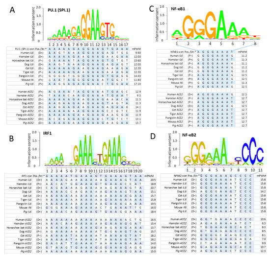 Existence of cis-regulatory elements (CREs) that bind typical non-ISGs transcription factors of (A) PU.1 (a.k.a. SPI1), (B) IRF1, and (C,D) NF-κB1/2 in the promoter regions of IL-6 and ACE2 gene orthologs from the representative two SARS-CoV-2-unsusceptible species (pigs and mice) and seven susceptible species. All three types of CREs have comparable Log2(mPWM) scores between ACE2 and IL-6 genes, except NF-κB2 that mediates non-canonical NF-κB response. (D) has a significant lower mPWN score (2–6 Log2 units), indicating ACE2 genes are among different non-ISGs group other than IL-6. P/D, proximal or distal regions of promoters; ± sense or antisense strands. mPWM scores were calculated using tools at https://ccg.epfl.ch/pwmtools/pwmscore.php with CRE Matrices are from MEME-derived HOCOMOCOv11 TF collection affiliated with the PWM tools. PWM, position weight matrix.