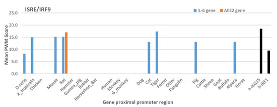 After determination of positive histone markers along the IL-6 and ACE2 gene bodies, we examined the existence of cis-regulatory elements (CREs) that interact with typical non-ISGs transcription factors, including PU.1 (a.k.a. SPI1), IRFs, and NF-κB1/2 in the promoter regions of IL-6 and ACE2 gene orthologs [,,,,,,]. We extracted the primary promoter sequences from IL-6 and ACE2 genes from 25 representative vertebrate species, which contained ten previously validated SARS-CoV-2-susceptible species and other naturally unsusceptible species based on collected evidence [,,,,]. As shown in Figure 3, all three types of CREs (i.e., PU.1, IRFs, and NF-κB) that mark non-ISG expression were mapped for cross-species existence in the promoter regions of both IL-6 and ACE2 genes. Significant PWM scores (p < 0.0001) were determined for their CREs when each was compared with the corresponding human CRE matrix (Figure 3A–C) []. ACE2 genes had a generally lower PWM score for these CREs than those for IL-6 genes, in particular the PWM scores for NF-κB2 CRE in ACE2 genes were at 2–8 Log2 units lower (Figure 3D). This indicates that ACE2 genes were less responsive to non-canonical NF-κB signaling mediated by NF-κB2 [,]. Because dysregulation of non-canonical NF-κB signaling contributes to various autoimmune and inflammatory diseases, the differential role of ACE2 and IL-6 in inflammatory immunopathies are worth further investigation [,]. Notably, only CRE matrices to IRF1 are shown in Figure 3C; both ACE2 and IL-6 gene promoters actually contain CREs binding IRF2-8 with high PWM scores, except for CREs interacting with IRF5 and IRF9 which had low PWM scores in most tested species (Figure 4 and Figure 5). Because IRF9 is a key component of ISGF3 and binding to ISREs to activate canonical ISG expression, this discovery evidently distinguishes ACE2 and IL-6 genes from the classical ISGs such as ISG15 and IRF1 (Figure 4) [,]. However, IL-6 genes of eight species maintain their IRF9 binding CREs; for example, in Zebrafish and frogs, only rat ACE2 gene showed a high PWM score for containing an IRF9 binding CRE (Figure 4). This further postulates a species-dependent trend of non-ISG evolution, and warrants further investigation in contributing to host–pathogen interactions.