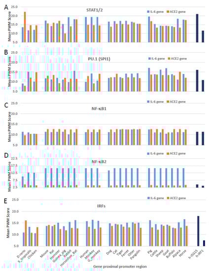 Figure 5 gathers cross-species analyses of mean PWM scores of the CREs, which bind STAT1/2, PU.1 (a.k.a. SPI1), NF-κB1, NF-κB2, and multiple IRFs (including, IRF1-4, IRF7, and IRF8 that show significant PWM scores with p < 0.0001 under the algorithm’s default) in the proximal promoter regions of IL-6 and ACE2 gene orthologs from the 25 representative vertebrate species. As shown, these bookmarking CREs for non-ISGs had comparable Log2(mPWM) scores between ACE2 and IL-6 genes across different species, and also showed species-specific variation to some extent. IL-6 genes generally had higher mPWM scores for more of the tested animal species with CREs that bind STAT1/2 and IRFs downstream of IFN signaling (Figure 5A,E) [,]. Of significant difference between ACE2 and IL-6 genes was their CREs’ PWM scores pertinent to NF-κB1 and NF-κB2 (Figure 5C,D). Whereas ACE2 genes evolved to be slightly more responsive to the canonical NF-κB1 signaling in most mammalian species (Figure 5C), IL-6 genes obtained much higher responsiveness to non-canonical NF-κB2 signaling (Figure 5D). Studies have shown that defects in non-canonical NF-κB2 signaling are associated with severe immune deficiencies, and dysregulation of this pathway contributes to the pathogenesis of various autoimmune and inflammatory diseases [,]. The epigenetic difference of IL-6 and ACE2 genes downstream of canonical NF-κB1 and non-canonical NF-κB2 signaling thus may serve as differential gene markers for inflammatory-related syndromes [,].