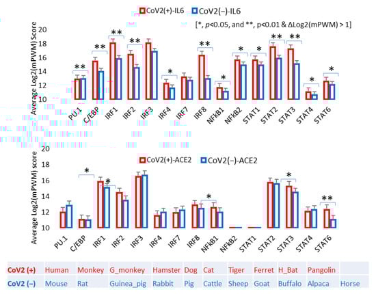 As previously described, in addition to its core role in the physiological regulation of blood volume/pressure and body fluid balance, the RAAS also critically affects inflammation, apoptosis, and other immune reactions. For instance, suppression of ACE2 increases Ang2 production to signal pro-inflammatory and apoptotic responses in affected tissues [,,]. When exacerbated by infection of an intracellular pathogen, such as SARS-CoV-2 in COVID-19 cases, a high inflammatory form of programed cell death, known as pyroptosis, is induced, accompanying massive production of pro-inflammatory cytokines including IL-1, IL-6, TNF and CXCL10 [,,]. Due to the potential clinical relevance to these CREs in COVID-19, we performed a comparative study to determine if the COVID-19 susceptible animal species obtained some epigenetic features in these core CREs in regulation of IL-6 and ACE2 expression. Figure 6 compares the mPWM scores of these core non-ISG CREs between two groups: known SARS-CoV-2-susceptible species [CoV2(+)] and unsusceptible species [CoV2(−)]. Figure 6 shows that ACE2 and IL-6 genes from CoV2(+) species contain CREs that have significantly higher mPWM scores. This indicates that, in some vertebrate species, non-ISGs such as ACE2 and especially IL-6 genes evolve to obtain high inductive propensity by inflammatory and IFN signaling [,,,,,,,]. Therefore, in addition to the ACE2 structure and affinity to S-RBD, the epigenetic evolution for IL-6 and ACE2 stimulation (reflected by higher mPWM scores), may serve as epigenetic biomarkers (or triggers) for susceptibility predictions of COVID-19 and other ARDS longitudinally across vertebrates and horizontally in subgroups of humans [,,,,,,,,].