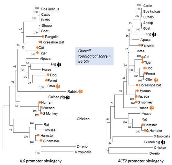 Cross-species phylogenic and topological comparison of IL-6 and ACE2 gene promoters. Evolutionary analyses were conducted in MEGA X. The evolutionary history was inferred by using the maximum likelihood method and Tamura–Nei model. The tree with the highest log likelihood (−52,755.39) is shown. The percentage of trees in which the associated taxa clustered together is shown next to the branches. Initial tree(s) for the heuristic search were obtained automatically by applying Neighbor-Join and BioNJ algorithms to a matrix of pairwise distances estimated using the Tamura–Nei model, and then selecting the topology with superior log likelihood value. For topological comparison between phylogenic trees generated using IL-6 and ACE2 gene proximal promoters, the phylogenies of Newick strings were generated using MEGA, and topological comparison between the Newick trees was performed with Compare2Trees at (http://www.mas.ncl.ac.uk/~ntmwn/compare2trees) to obtain the overall topological scores. Orange circle: COVID-19 susceptible species. Arrows: other tentative marker species to determine which group (IL-6 or ACE2) of non-ISGs are more determined for COVID-19 susceptibility. Abbreviations are as in Figure 4.