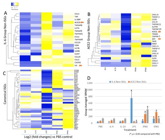 Genome-wide categorizing non-ISGs based on the similarity of inductive pattern to IL-6 and ACE2 genes. The non-biased genome-wide transcriptomic data were generated using an RNA-Seq procedure in porcine lung macrophages stimulated with each activation stimulator of IL-4, IL-10, LPS, IFN-α or IFN-γ at 20 ng/mL and infected by porcine arterivirus virus for 5 h, using an Illumina procedure as previously described []. Significantly differentially expressed genes (DEGs) in the renin–angiotensin system (RAS), interleukin (IL)-6, TNF, and chemokine super-families were annotated and grouped using heatmaps according to their inductive expression patterns similar to: (A) IL-6, (B) ACE2; (C) Examples of canonical ISGs as reference; (D) Averaged transcriptomic expression levels (normalized at reads per kilobase of transcript per million mapped reads, RPKM) of the grouped ISGs or non-ISGs above. Indicated by arrows, pigs have two ACE2 isoforms, namely ACE2L and ACE2S, which have different expression patterns; ACE2S similar to IL-6 showed to be less responsive to IFN-α but highly responsive to LPS and IFN-γ. In contrast, ACE2L and another key gene, AGT, in RAS were categorized together with other non-ISGs (B), which is more like the expression pattern of canonical ISGs (C) than the IL-6 group (A).
