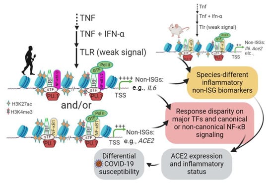 The expression of ACE2 is inter-regulated by multiple physio-pathological factors, including intracellular pathogenic infection, pre-existing inflammatory condition from comorbidities, and inflammatory cytokines including TNF and IFNs [,,,,,]. Several studies have demonstrated that human ACE2 gene behaved like an interferon-stimulated gene (ISG) and was stimulated by viral infection and IFN treatment; however, mouse Ace2 gene was not [,,]. Canonical ISGs describe over a thousand cellular genes that are induced by IFN simulation via the IFN-JAK-STAT signaling axis []. These canonical ISGs are mainly induced by type I and type III IFNs but overlap with those upregulated by type II IFN (i.e., IFN-γ) [,,,]. These ISGs comprise a front line of antiviral immunity to restrict virus spreading from the initial infection sites []. However, based on gene evolution and epigenetic analyses, ACE2 may not be a member of these classical antiviral ISGs, and more likely belongs to the non-canonical ISGs (non-ISGs) such as IL-6 (a.k.a. IFN-β2 in humans) [,,,,]. These non-ISGs are primed under a pre-inflammatory condition and stimulated by IFN or IFN plus TNF through an epigenetic cascade involving positive histone modification (mainly H3K4me3 and H3K27ac) to increase chromatin accessibility for binding by transcription factors (including PU.1, IRFs, and NF-κB) and culminating in non-ISGs expression (Figure 1) [,,,]. To confirm that, we conducted cross-species comparative analysis between IL-6 and ACE2 genes. First, annotation of ENCODE epigenetic datasets discovered similarity of H3K4me3 and H3K27ac markers between IL-6 and ACE2 gene promoters in both humans and mice; however, significantly higher Z-scores and enrichment of H3K4me3 and H3K27ac in human IL-6 and ACE2 genes were detected than in their mouse orthologs, respectively []. Secondly, detection of cis-regulatory elements (CREs) that bind core transcription factors of non-ISGs, including PU.1, IRFs, and NF-κB, in ACE2 and IL-6 gene proximal promoter regions across 25 representative animal species [,]. Thirdly, we found that the evolutionary increase in ACE2, and especially the IL-6 gene response to inflammatory and IFN signaling may serve as an epigenetic marker for COVID-19 susceptibility in some animal species, including humans. Finally, using our non-biased RNA-Seq data, we further categorized more non-ISGs that resemble the expression pattern of either IL-6 or ACE2 []. Notably, we detected two ACE2 isoforms, which differ in both proximal promoters and coding regions, in some livestock species including pigs, dogs, and cattle []. In pigs, the ACE2 short isoform (ACE2S) has an expression pattern more similar to IL-6 than the long isoform (ACE2L). Collectively, our findings characterize ACE2 and IL-6 genes as non-ISGs responding differently to inflammatory and IFN signaling, and their epigenetic properties may serve as biomarkers to predict COVID-19 susceptibility in vertebrates longitudinally and partially explain COVID-19 inequality in people of different subgroups [,,,,].