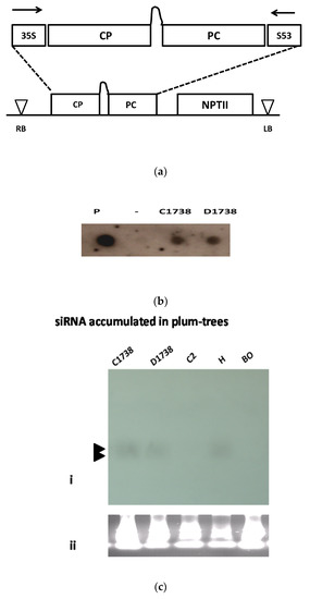 - Kundu, J.K.; Briard, P.; Hily, J.M.; Ravelonandro, M.; Scorza, R. Role of the 26nt siRNA in the resistance of transgenic Prunus domestica graft inoculated with Plum pox virus. Virus Genes 2008, 36, 215–220. [Google Scholar] [CrossRef]