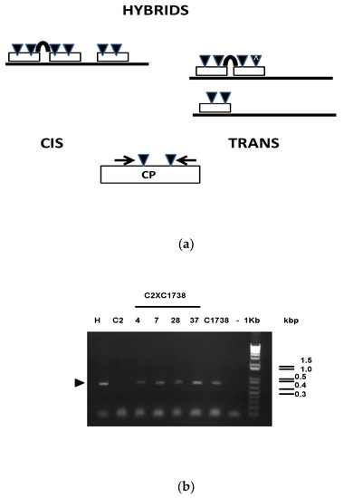 To conclude, from the genetic cross C2 × C1738, 28/60 of hybrid clones had no evidence of methylation indicative of silencing, 32 clones harbor the transgene CP of C2 clone and amidst the 32 clones only four clones have evidence of methylation and probably harbor the two transgenic events (Table 1). The inheritance of methylation has frequently occurred in eukaryotic systems, and these viral origin genes are no different [12,13,16,17,22,24]. It appears to be methylated regardless of whether or not the insertion of the viral genes in one locus (cis position) or their split in two different loci (trans position), where four hybrid clones were identified; C-2 × C-1738-4, -7, -28 and -37 hybrids (Figure 3). To conclude, from the genetic cross C2 × C1738, 28/60 of hybrid clones were not methylated and probably did not carry the IRSH, 28 clones harbor the transgene CP of C2 clone and only four clones harbor the two targeted events (Table 1).