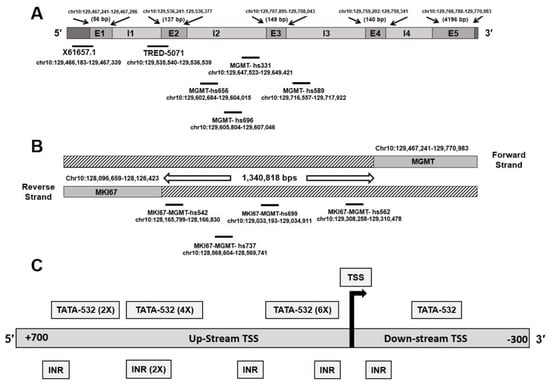 The MGMT gene locus occupies a region of 303,780 bps in the forward (plus) strand of the long arm of chromosome 10 at 10q26.3 and genomic coordinates (GRCh38/hg38): chr10: 129,467,184–129,770,983. The MGMT-mRNA (NM_002412) space of 1372 bp is comprised of five exons and one MGMT promoter X61657.1, whereas other databases showed five more overlapping promoter sequences that were combined by us to form a 2019 bp sequence called the MGMT-E1 promoter, mapped at 5′ of the untranslated MGMT-E1 []. In silico analysis of the revised MGMT-E1 promoter revealed the presence of a genetic switch MYC/MAX/MAD, and transcriptional pausing factor GAF motifs. This study analyzed the molecular features of the unexplored but predicted MGMT-E2 promoter (TRED-5071) located at 5′ of MGMT-E2 (Figure 1A). Since the gene enhancers and promoters often cooperate and function similarly to regulate gene expression [], we also performed a search for enhancer sequences in the MGMT gene region using the VISTA Enhancer Browser (https://enhancer.lbl.gov, accessed on 14 May 2021.), a website listing experimentally validated enhancers. Enhancers are cis-acting regulatory sequences that function independently of orientation and present at various distances from their target promoters and act to increase gene transcription []. Interestingly, our search found four enhancers mapped in MGMT introns 2 and 3 and an additional four enhancers mapped in the genomic space between MGMT and MKI67 loci (Figure 1A, Table 1). Validating our efforts is the recent demonstration that a 3 kb enhancer located between the promoters of Ki67 (MKI67, a marker of cell proliferation) and MGMT genes serves to increase the MGMT expression significantly and confer temozolomide resistance []. The influence of the other eight enhancers (many of them near the Ki67/MKI67 gene) (Table 1) on MGMT transcription is unknown and requires further studies.