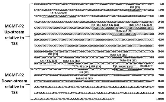 In this context, our bioinformatic search using in silico analysis of the TRED database [] revealed the presence of a novel unexplored promoter proximal to MGMT’s exon 2 [], and part of this study was aimed at validating its involvement in MGMT expression. The in silico analysis showed that the MGMT-E2 promoter is characterized by the absence of CGI, motifs for GAF factor, and MYC/MAX/MAD element, which are all associated with silencing of gene expression and transcriptional pausing []. On the other hand, the MGMT-E2 promoter showed abundant binding sites for INR (initiator element), ATF1 (activating transcription factor 1), BRE (the TFIIB recognition element), and a large number of TATA box motifs (Figure 2) that are regulatory sequences associated with a core promoter involved in active transcription []. We provided experimental data that confirmed the MGMT-E2 promoter is highly expressed compared to the feebly expressed MGMT-E1 promoter in SF188 and T98G, two known MGMT-proficient GBM cell lines. Further, we showed by RT q-PCR that MGMT-E2 and MGMT-E5 amplicons are expressed at comparable rates, which is an indication of the critical role played by the MGMT E2 promoter in MGMT expression and the formation of full-length MGMT mRNA transcripts. More definitive evidence for an exceptionally low transcription rate of MGMT-E1 contrasting with a highly efficient faster rate for MGMT-E2 was obtained by nuclear transcription assays, which elongate the pre-initiated transcripts for short stretches and provide accurate information on RNA polymerase occupancy at a given sequence.