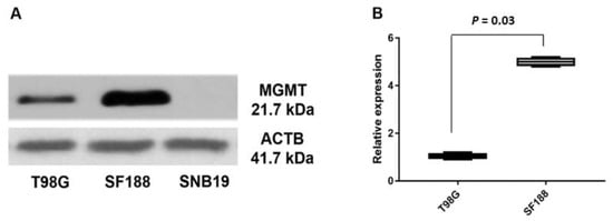 (A) Western blot of MGMT in T98G, SNB19, and SF188 GBM cells. (B) Relative protein expression values in the T98G and SF188 cell lines (p < 0.05).