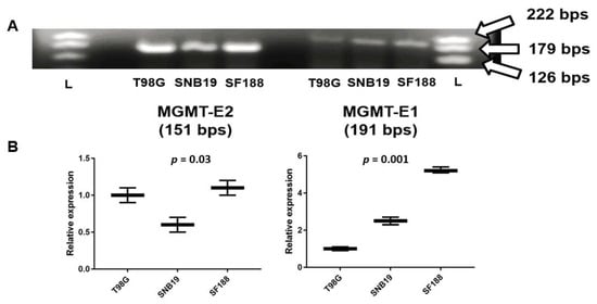 RT-PCR analyses of MGMT E-1 and MGMT E-2 expression in T98G, SNB19, and SF188 cells. (A) Amplicons visualized after agarose gel electrophoresis and EtBr staining are shown. (B) One-way ANOVA analyses of MGMT-E2 and MGMT-E1 relative expression (p < 0.05).