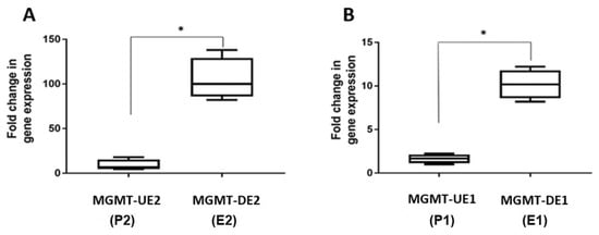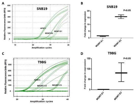 RNA was extracted from 70–80% confluent GBM cells using RNAzol reagent (GeneCopoea, Rockville, MD, USA). cDNAs were prepared from 0.5 µg of total RNA using specific primer sets for MGMT-exons 1, 2, and 5. The primer sets for the MGMT-E1 promoter were F: GCGCTCTCTTGCTTTTCTCA, R: GACACTCACCAAGTCGCAAA. The primers for the MGMT-E2 promoter were F: TGGAGCTGTCTGGTTGTGAG, R: TGGAAAACATGCCGTTATCA. The primers for extension of MGMT-exon 5 were F: CCGTGAAGGAATGGCTTCTG, R: TAGCTCCCGCTCCCTTG. Normalization was performed using the hypoxanthine-guanine phosphoribosyl transferase 1 (HPRT1) as the reference gene [] using the primers F: TGAGGATTTGGAAAGGGTGT, R: GAGCACACAGAGGGCTACAA. The QIAGEN one-step RT-PCR kit was used for conventional RT-PCR according to standard protocols supplied by the manufacturer. The amplified cDNA fragments and DNA marker ladder of 100 bp (QIAGEN) were separated using 1.5% agarose gel and visualized by ethidium bromide staining. The cDNA image documentation and expression measurements were performed by densitometry using the VersaDoc Imaging System and ImageJ software. RT q-PCR reactions were performed in triplicate using the Taq Universal SYBR Green One-Step Kit (BIO-RAD) and quantified by the BIO-RAD iCylcer iQ system software. Normalization and relative expression analysis for the MGMT target gene was carried out using HPRT1 as a reference gene [] according to the Livak 2−∆∆CT method, which was used to analyze relative gene expression data of real-time quantitative PCR [].
