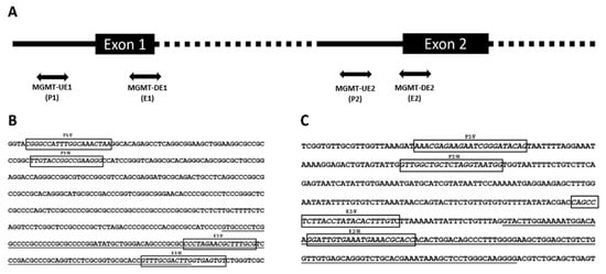The MGMT gene, located on chromosome 10q26, occupies a region of 303,780 nucleotides and contains 5 exons and 4 introns []. Exon 1 and a large part of exon 5 are non-coding and the translated protein has its origin in exon 2 []. A 69 kb Intron-1 separates the exons 1 and 2. A minimal GC-rich promoter of 1.15 kb proximal to exon 1 was characterized in 1991 []. This promoter lacks TATA and CAAT box motifs but is notable for having a 777-bp CpG island with 97 CpG sites and an enhancer-binding site, and sites for the SP-1 and AP-1 transcription factors including a glucocorticoid response element [,]. It is now well established MGMT expression is epigenetically silenced through promoter methylation in a large subset of brain tumors [], and MGMT has emerged as one of the best-studied candidates for its susceptibility to cytosine-phosphate-guanine (CpG) island (CGI) for DNA methylation in glioma and other cancers [,]. Many studies have shown a correlation between MGMT protein expression in gliomas and the methylation level of the promoter region, which is usually about 30 to 60% [,]. To be more specific, the MGMT promoter methylation levels are 20–30% for grade I gliomas, 60–80% for grade II, 40–50% for grade III, and 20–45% for grade IV tumors []. Studies in glioma cell lines comparing the MGMT expression and the extent of its promoter methylation have also been performed [,]; these investigations have identified two methylated areas in the CpG island: a highly methylated region upstream of the transcription initiation site, including a minimal promoter, and a highly methylated region downstream of exon 1 [,]. Because MGMT promoter methylation and the resulting decrease in MGMT expression in brain tumors are associated with a better response to chemotherapy, greater overall survival, and longer time to disease progression [,], currently, molecular assays are routinely employed in glioma specimens for therapeutic design and prognostic measures [,]. Methylation of CpGs located at the first noncoding exon and enhancer seems more critical for loss of MGMT expression; therefore, these sequences are probed in clinical assays [].