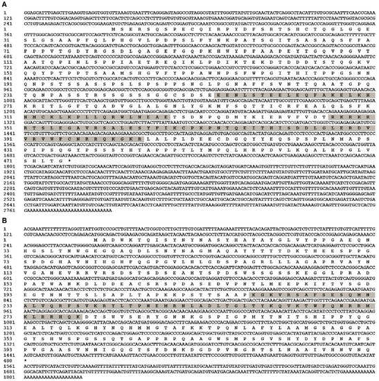 Full-length cDNA sequences and predicted polypeptides of (A) EcPou5f1 and (B) EcNanog. Gray shadow: POUs and POUhD in (A), and HD in (B). Stop codon is labeled with an asterisk (*).