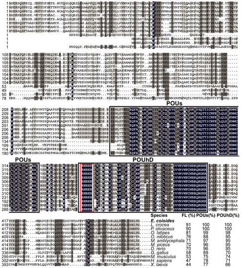 Multiple sequence alignment and comparison of EcPou5f1 with the homologs from other vertebrates. Black shadow: 100% identity; Brown shadow: 75% ≤ identity < 100%; Light brown shadow: 50% ≤ identity < 75%. Large black box: POUs and POUhD domains; Red box: a nuclear localization motif of RKRKR. The percent identity among EcPou5f1 and other Pou5f1 homologs in full-length (FL) and POU domains is displayed at the end of the alignment. The species’ name with a bold font indicates the EcPou5f1 protein of orange-spotted grouper. GenBank accession numbers for Pou5f1 are as follows: E. coioides, OL439940; L. crocea, NP_001290294; P. olivaceus, ALA23412; O. latipes, NP_001098339; Oreochromis niloticus, XP_003444455; M. amblycephala, AVV48156; Mylopharyngodon piceus, ATP62009; D. rerio, NP_571187; Gallus gallus, NP_001296301; M. musculus, NP_038661; H. sapiens, NP_002692; and Xenopus laevis, NP_001079832.