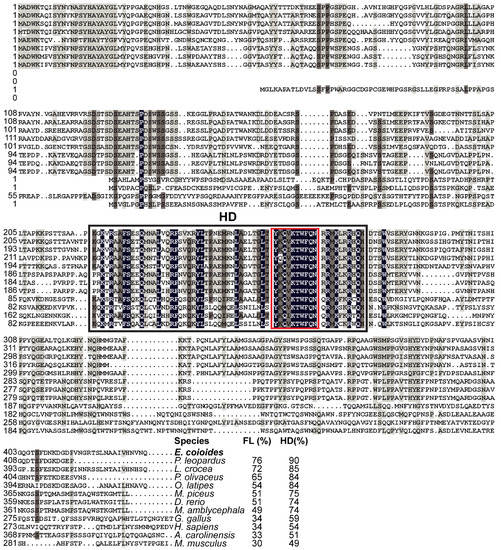 Multiple sequence alignment and comparison of EcNanog with the homologs from other vertebrates. Black shadow: 100% identity; Brown shadow: 75% ≤ identity < 100%; Light brown shadow: 50% ≤ identity < 75%. Large black box: HD domain; Red box: a nuclear localization motif of YKQVKTWFQN. The percent identity among EcNanog and its homologs in full-length (FL) and HD domain is displayed at the end of the alignment. The species name with a bold font indicates the EcNanog protein of orange-spotted grouper. GenBank accession numbers for Nanog are as follow: E. coioides, OK415852; Plectropomus leopardus, XP_042366645; L. crocea, XP_010739920; P. olivaceus, AGX84982; O. latipes, NP_001153902; M. piceus, ATP62010; D. rerio, NP_001091862; M. amblycephala, AMY98422; G. gallus, NP_001139614; H. sapiens, NP_079141; M. musculus, NP_082292; and Anolis carolinensis, XP_003216891.