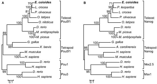 In phylogenetic tree analysis, EcPou5f1 and EcNanog were respectively clustered into a single clade with fish homologs and separated from other POU and HD proteins, including Pou1, Pou3, Nkx2.5, and Msx1 (Figure 4A,B).