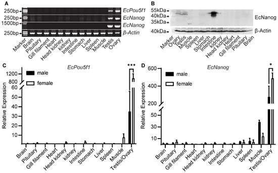 Semi-quantitative PCR results showed that a 245 bp fragment of EcPou5f1 was limited to gonads, whereas a 240 bp fragment of EcNanog was highly detected in gonads and weakly in other tissues, including brain, pituitary, head kidney, kidney, stomach, liver, and muscle (Figure 5A). However, the 1299 bp ORF of EcNanog was only amplified in gonads (Figure 5A). In Western blotting, EcNanog signals were detected as three strong bands between 40 and 55 kDa in intestine, a distinct band between 40 and 55 kDa in gonads and stomach, a single band about 35 kDa in muscle, a weak band between 40 and 55 kDa in kidney, as wells as no bands in other somatic tissues (Figure 5B). In RT-qPCR analyses, EcPou5f1 and EcNanog were extremely expressed in gonads with a higher level in ovary than in testis (Figure 5C,D).