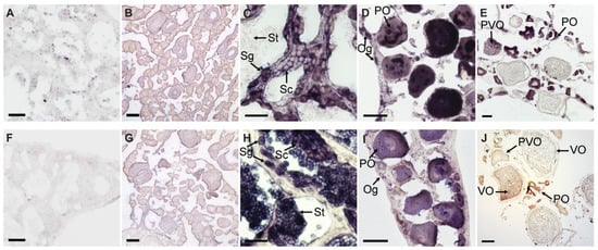 The sense riboprobes of EcPou5f1 and EcNanog showed no specific signal in ovary and testis (Figure 6A,B,F,G). In testis, the antisense probe signal of EcPou5f1 was intense in spermatogonia, moderate in spermatocytes, and no signal could be detected in spermatids (Figure 6C). In ovary, the antisense probe signal of EcPou5f1 was obviously observed in oogonia, primary growth stage oocytes, and cortical-alveolus stage oocytes, but scarcely detected in vitellogenic stage oocytes (Figure 6D,E). In some primary growth stage oocytes, EcPou5f1 mRNA signals were unevenly distributed in perinuclear speckles and nuclei (Figure 6D). The distribution of EcNanog mRNA in gonads had some differences from EcPou5f1 mRNA. In testis, EcNanog mRNA signal was observed in the spermatogenic cells from spermatogonium to spermatid (Figure 6H). In ovary, EcNanog mRNA signal was detected in oogonia, primary growth stage oocytes, cortical-alveolus stage oocytes, and early vitellogenic stage oocytes, but scarcely in late vitellogenic stage oocytes (Figure 6I,J). In addition, it was observed that a few small oval cells, possibly oogonia or oogonial stem cells, were EcPou5f1 or EcNanog-positive (Figure 6D,I).