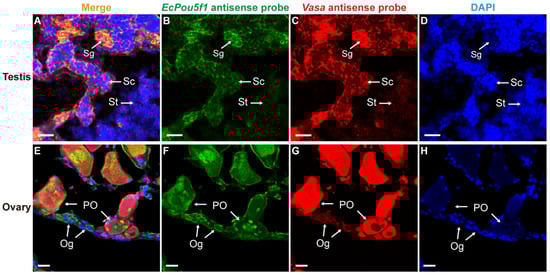 In order to further verify the reliability of EcPou5f1 and EcNanog as germ cell-specific genes, we adopted Vasa, a well-known germ cell-specific gene [], as a positive control in dual-label ISH. In testis and ovary, the mRNA signal of EcPou5f1 had an identical localization with Vasa mRNA signal in male and female germ cells (Figure 7). It was worth mentioning that the very faInt. fluorescence of EcPou5f1 mRNA could be observed in spermatids by Tyramide Signal Amplification system (Figure 7B). Similar to the chemical ISH result of EcPou5f1 mRNA in ovary, the fluorescent signal of EcPou5f1 mRNA was obviously observed in the cytoplasm of oogonia, and the perinuclear speckles and nuclei of some primary growth stage oocytes (Figure 7F). In ovary, the small oval cells, possibly oogonia or oogonial stem cells, with EcPou5f1 signal would be marked by Vasa signal (Figure 7E–G).