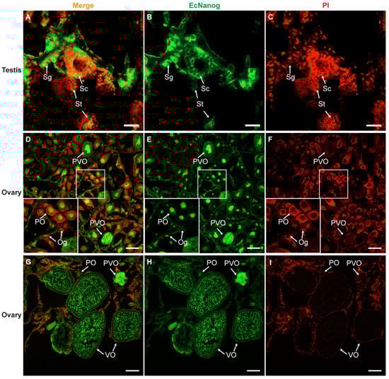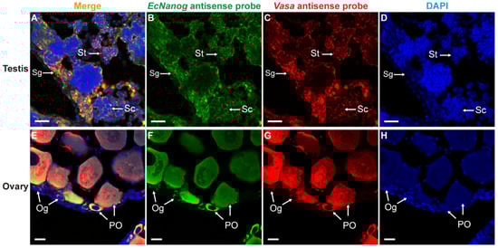 Likewise, EcNanog signal had an identical localization with Vasa signal in male and female germ cells (Figure 8). In testis, the EcNanog and Vasa signals were detected in different spermatogenic cells (Figure 8B,C). The fluorescent signals of EcNanog and Vasa were distributed in the whole cytoplasm of female germ cells (Figure 8F,G). In ovary, the small oval cells, possibly oogonia or oogonial stem cells, showed the EcNanog and Vasa-positive signals at the same time (Figure 8E–G).
