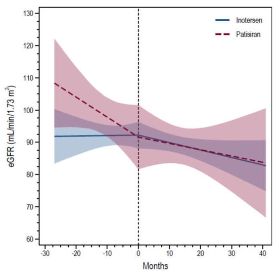 The graph reports the estimated change in eGFR over time before and after treatment initiation with inotersen (solid blue line) and patisiran (dotted red line), with shades representing 95% confidence intervals. The vertical dotted line represents treatment initiation. No significant difference either between the two groups of treatment or within-group before and after therapy (all p-values > 0.05) was observed.