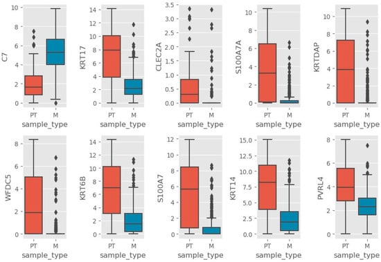 The expression of the Top 10 genes obtained from random forest as potential biomarkers was further examined (Figure 2). C7 is upregulated in metastatic sample compared to primary tumor, while KRT17, CLEC2A, S1007A, KRTDAP, WFDC5, KRT6B, S100A7, KRT14, and PVRL4 are downregulated (or upregulated in primary tumor compared to metastatic sample). The rest of the genes showing significant (p < 0.05, Welch’s t-test, see Supplementary Materials File S10) upregulated expression in primary tumor or metastatic sample type are shown in Table 2.