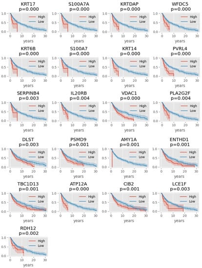 Our analysis shows that high expression of KRT17, S100A7A, KRTDAP, WFDC5, KRT6B, S100A7, KRT14, PVRL4, SERPINB4, IL20RB, VDAC1, PLA2G2F, DLST, PSMD9, AMY1A, ENTHD1, TBC1D13, ATP12A, CIB2, LCE1F, or RDH12 is associated with worse survival (Figure 3).