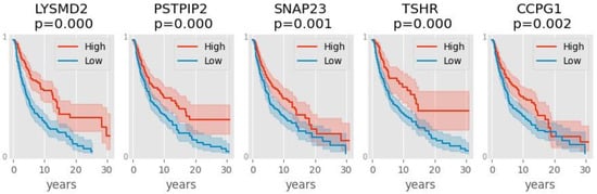 When expression of these genes was correlated with patient survival, we found genes whose high expression correlate with worse (Figure 3) or better (Figure 4) survival. Some of the genes that were highly expressed in primary tumors (such as the keratin genes) turned out to be predictive, but, oddly, of poor outcome. We can only surmise that possibly the early stage of melanoma increases the expression of these genes, but this disruption may be detrimental to the patient eventually. Only five genes were found to be predictive of good outcome when highly expressed in melanoma: LYSMD2, PSPIP2, SNAP23, TSHR, and CCPG1. Of these, only TSHR was identified by the ensemble classifier. Thyroid Stimulating Hormone Receptor (TSHR) controls thyroid cell metabolism, and defective TSHR causes hyperthyroidism. The expression of this hormone receptor has been observed in melanoma []; its downregulation has been associated with thyroid cancer metastasis and is prognostic for poor survival [], in agreement with our findings.