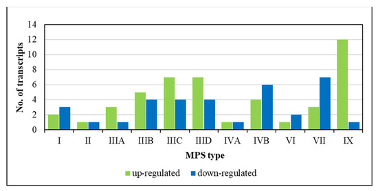 Number of up- and down-regulated transcripts of genes coding for lncRNAs (Gene Ontology term GO:0140742 (lncRNA transcription) in the QuickGO database (https://www.ebi.ac.uk/QuickGO/, last accessed on 5 December 2022)) in different types of MPS relative to control cells (HDFa).