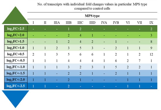 Specific genes encoding lncRNAs occurring at especially elevated or decreased levels (over ~6-fold, i.e., log2FC > 2.5 or <−2.5) in the MPS cells have been identified, and they are presented in Table 3. Again, the direction of the changes was always the same for each specific lncRNA type, i.e., every lncRNA was either up- or down-regulated in all MPS types. This confirms the uniform character of the changes in the levels of lncRNAs in MPS, irrespective of the disease type.