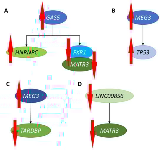 Correlations of increased (red, upward-pointing arrows) and decreased (red, downward-pointing arrows) levels of GAS5 (A), MEG3 (B,C), and LINC00856 (D) lncRNAs with significant changes (either increased or decreased abundance of mRNAs, marked by upward- or downward-pointing red arrows, respectively) in expression of specific genes in MPS cells.